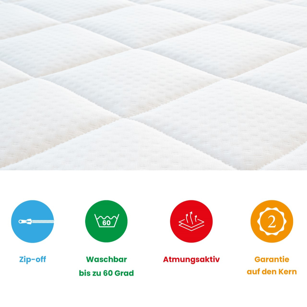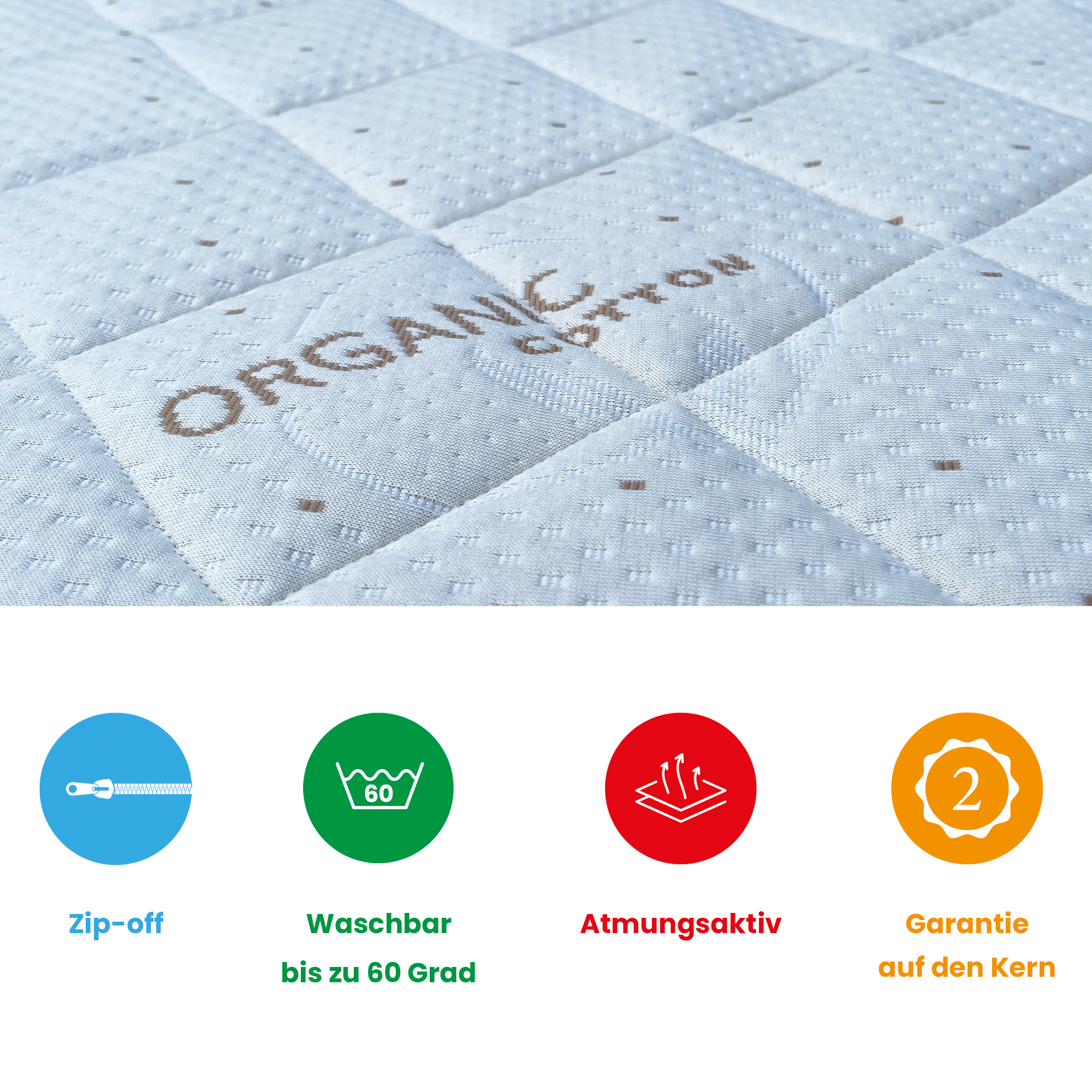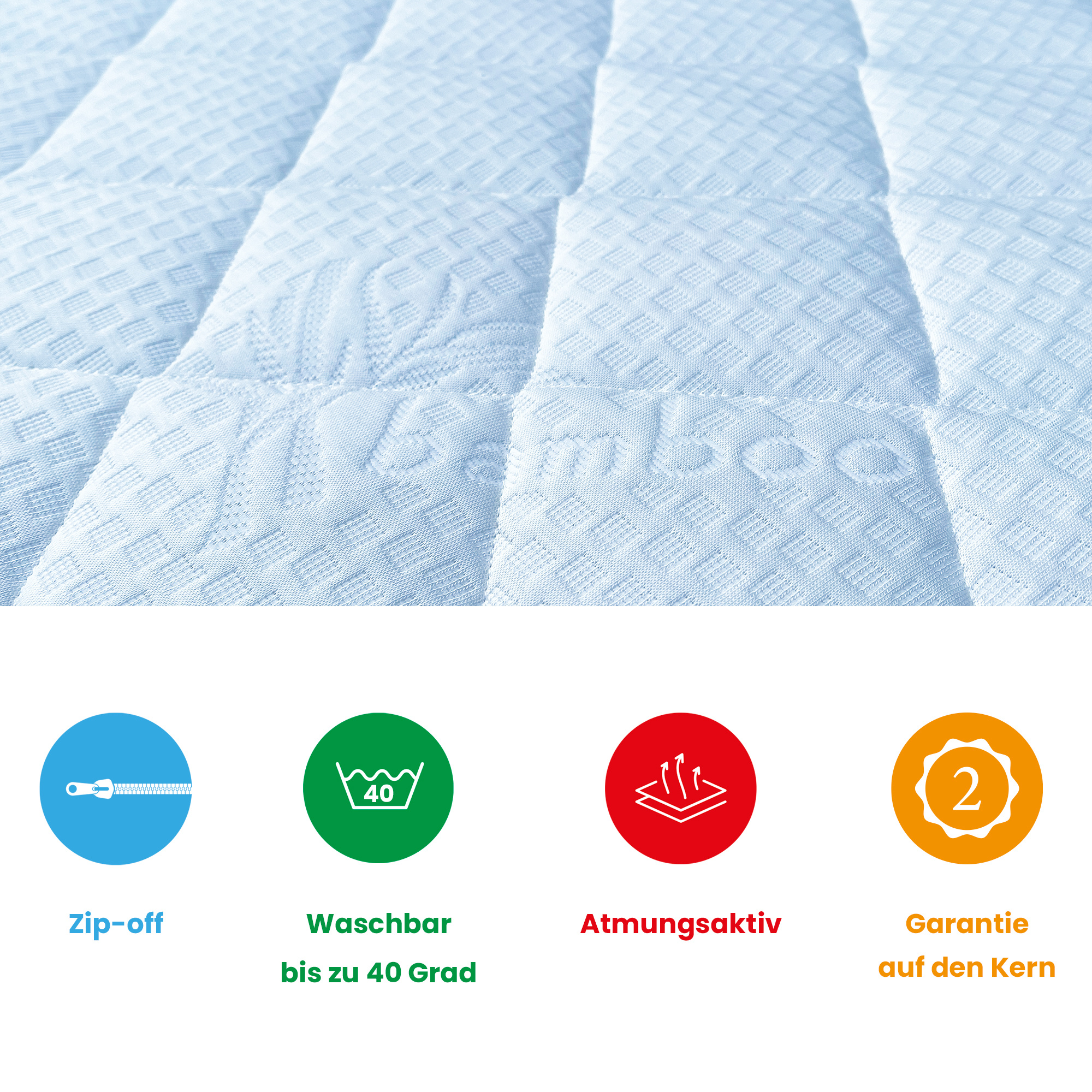 Standardmäßig besteht Ihre Matratze aus einem luxuriösen Doppeltuch. Gegen eine zusätzliche Gebühr können Sie zwischen Bambus mit Ecoshield, Bio-Baumwolle, Tencel oder Cool Touch wählen.